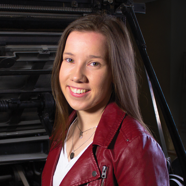 Judith jobber på pre-press og tar hånd om filer for videre produksjon på en trygg måte slik at kvaliteten blir som forventet.